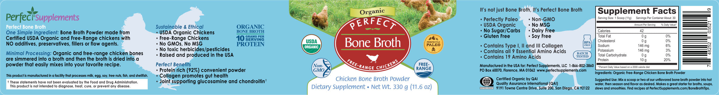 Perfect Bone Broth is a nutrient-rich, freeze-dried chicken bone broth powder made from grass-fed, organic chicken. Sourced and simmered the traditional way, it delivers the full spectrum of collagen, amino acids, and minerals your body needs to support joints, skin, digestion, and immunity—in a convenient and shelf-stable form.