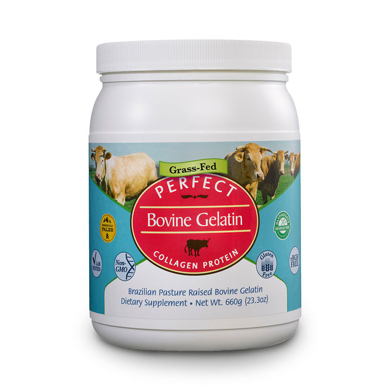 Perfect Bovine Gelatin is a clean, grass-fed collagen protein made from the hides of pasture-raised Brazilian cattle. Unlike hydrolyzed collagen, this form of gelatin gels when cooled, making it ideal for culinary uses like gummies, broths, or healthy desserts. It also delivers the same Type I and III collagen your body needs for joint, skin, gut, and bone health—in a wholesome, minimally processed form.