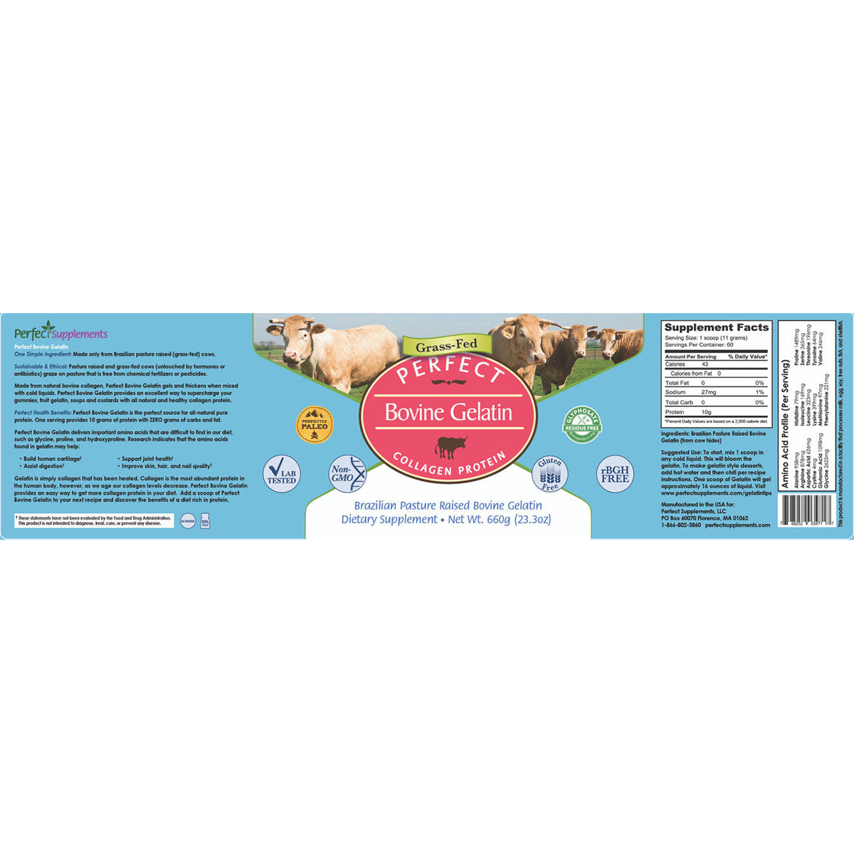 Gelatin has long been used in traditional diets to support gut lining integrity, reduce inflammation, and promote tissue repair. Perfect Supplements takes that a step further by offering a gelatin that's free of hormones, antibiotics, GMOs, and fillers.