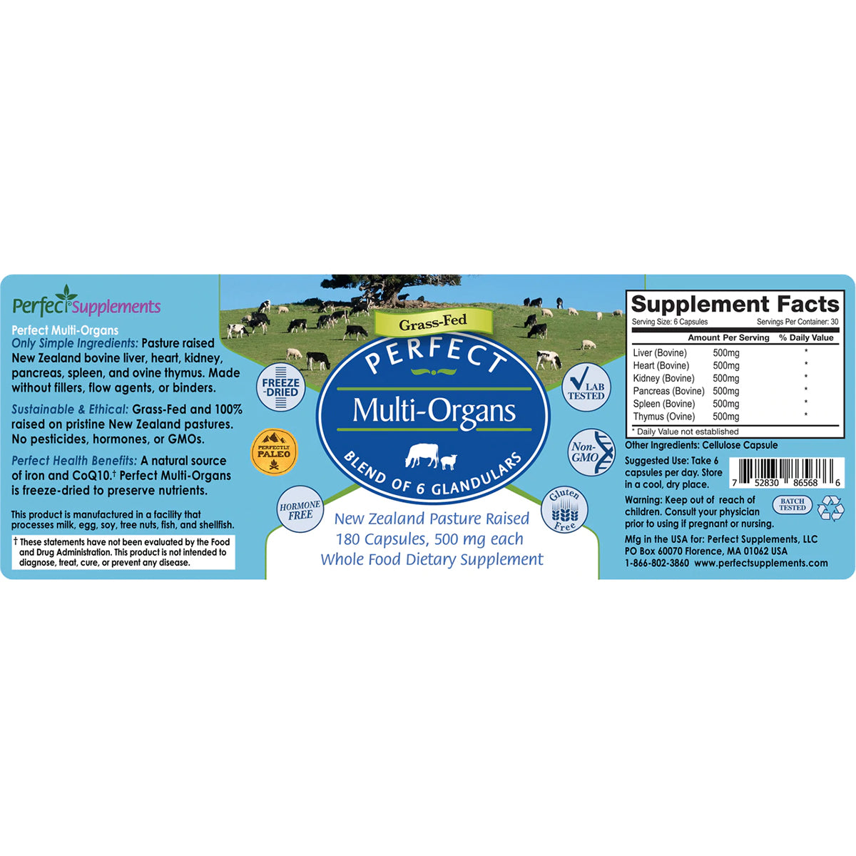 Perfect Multi-Organs is a nutrient-dense, whole-food supplement made from six of nature’s most powerful ancestral superfoods: beef liver, heart, kidney, pancreas, spleen, and thymus. Sourced from 100% grass-fed and grass-finished New Zealand cattle, this organ blend is freeze-dried to preserve its nutritional potency and offered in both easy-to-swallow capsules and a versatile powder.